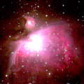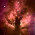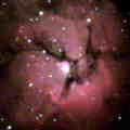 Emission Nebulae Emission nebulae are bright clouds of ionized gas and dust that are actually one of the late stages in the formation of a open star cluster. The sequence of events starts out with a large, cold, dark cloud of molecular gas and dust. Although these dust clouds can remain stable for billions of years, when an external compression wave passes through the cloud, it begins to condense into stars. Each new star that forms leaves a hole in the cloud, reducing the gas pressure locally, but eventually heating up and increasing both the temperature and the pressure a short distance from the young star. This heating and compression increases the rate of star formation, and somewhat counter intuitively increases the size of the stars as well. Eventually, this leads to the creation of the largest of all stars (types O and B), which radiate intensely in the ultra-violet, ionizing the remainder of the cloud and causing its evaporation and eventual dissipation. At this point, we see the entire structure as a bright emission nebula with an embedded and partially hidden star cluster. The process now evolves rapidly, and within a million years, all the gas and dust is gone, leaving a new young open star cluster in its place. Three examples of emission nebulae are shown at the left. The Flame (top) is being ionized and illuminated by a blue type O super-giant just outside the field of view. The Trifid (center) is a hollow bubble with two ionizing stars at its center (one type O and one type B). The Trapezium (bottom) consists of four type OB super-giants that have already blown away most of the surrounding nebula. | |||