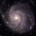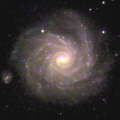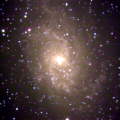 Grand Design Spiral Galaxies Grand design spiral galaxies are flat and wound up like a hurricane. They are amongst the most picturesque objects in the sky. Shown at the left top is NGC5457 (M101), which can be found just to the west of the handle of the big dipper in the constellation Ursa Major the Great Bear. Directly beneath it is the very nearby NGC598 (M33) in the constellation Triangulum, followed by the much more distant NGC1232 in the constellation Eridanus. | |||
