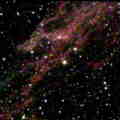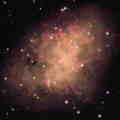 Supernova Remnants Supernova remnants are large and rapidly expanding fields of debris expelled by the titanic explosion that occurs at the end of the life cycle of a large star (8 to 50 solar masses). In these very massive stars, gravitation both moderates and overpowers the tremendous energy of helium burning, and the core of the star grows larger and more massive as it evolves. Helium burning is eventually replaced by carbon, oxygen, neon, and silicon stages. Somewhere along this sequence, the core becomes gravitationally unstable and catastrophically collapses into what is called a "neutron star". This event releases as much energy in a few dozen milliseconds as the sum of all the energy released by the star in its several million year lifetime. The resulting fireball is so bright that it easily outshines its parent galaxy and for several weeks it can bee seen from across the entire universe. All that remains of the original star is a 20 kilometer glob of sub-atomic particles, endowed with a tera-gauss magnetic field and spinning up to a few hundreds of revolutions per second. As it slowly spins down, dissipating its angular momentum in the process, it can be observed from Earth as a "pulsar". Shown at the left is the 950 year old Crab Nebula (top) and two shots (center and bottom) of the much older and larger Bridal Veil Nebula. | |||