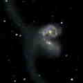 Interacting Galaxies Two or more galaxies interacting with one another are very common occurrences in the universe around us. Shown at the top left are the Siamese Twins NGC4567 & NGC4568 in the constellation Virgo the Virgin. The cental image shows the Antennae Galaxies NGC4038 & NGC4039 in the constellation Corvus the Crow. Their recent very close encounter has thrown out two tails of stars, each of which is more than a million light years in length. At the bottom of the set is the incredibly beautiful Whirlpool Galaxy NGC5194 (M51) and its dwarf companion NGC5195 in the constellation Canes Venatici, the two hunting dogs of Bootes: Astarion and Chara. | |||